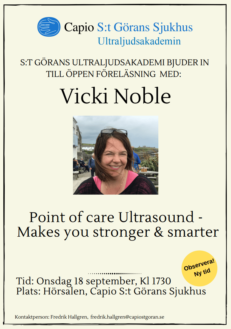Capio S:t Göran och Ultraljudsakademin bjuder in till en öppen föreläsning med den amerikanska POCUS-gurun Vicky Noble den 18 september kl 17:30 i Hörsalen på Capio S:t Görans sjukhus!