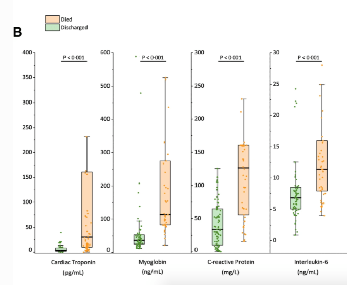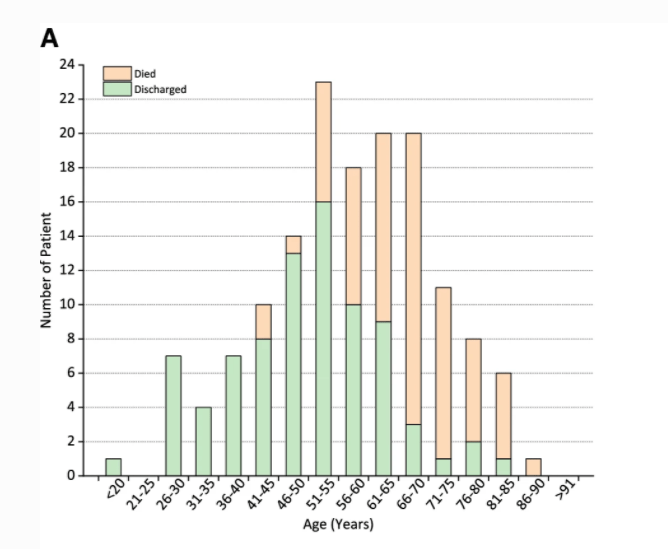 I en retrospektiv observationsstudie från Wuhan jämfördes 68 patienter som avlidit till följd av COVID-19 med 82 patienter som testats positiva för COVID-19 men överlevt och skrivits ut från sjukhuset. Alla patienterna vårdades på sjukhus. 44 % av patienterna som avled hade vårdats på IVA medan 13 % av de överlevande hade det. Studien kommunicerades i ett letter to the editor i Int Care Med 3 mars 2020. Där redovisades följande kliniska karakteristika och utfallsmått: