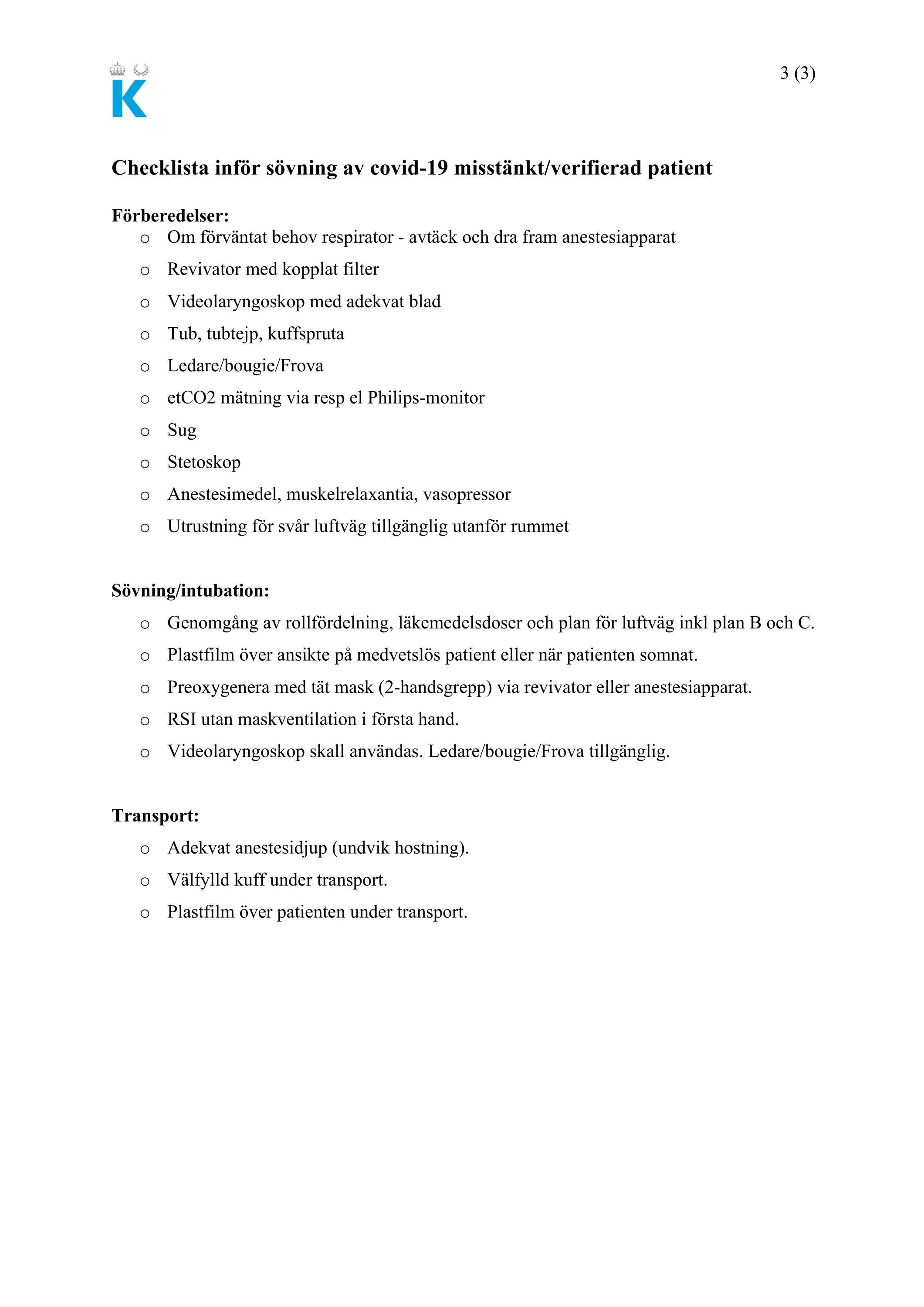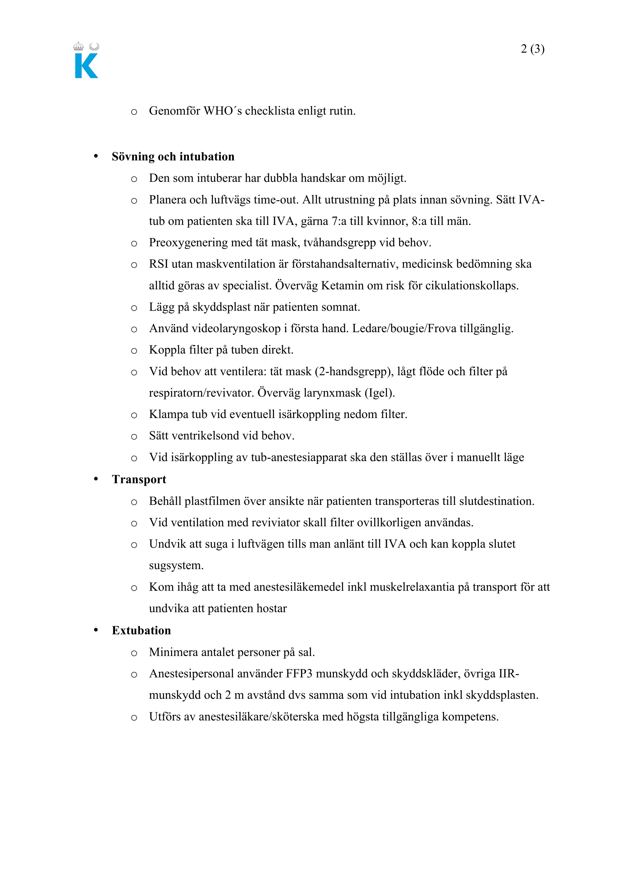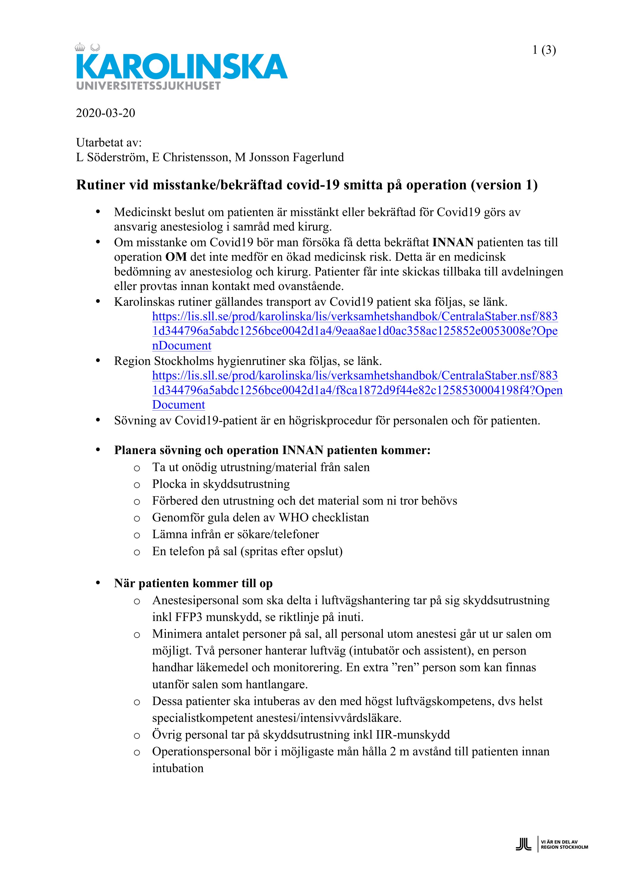 Dessa riktlinjer gäller vid Karolinska Universitetssjukhuset i Solna. Riktlinjerna får såklart användas på andra sjukhus – se dock till att förankra och eventuellt anpassa riktlinjerna för respektive verksamhet.