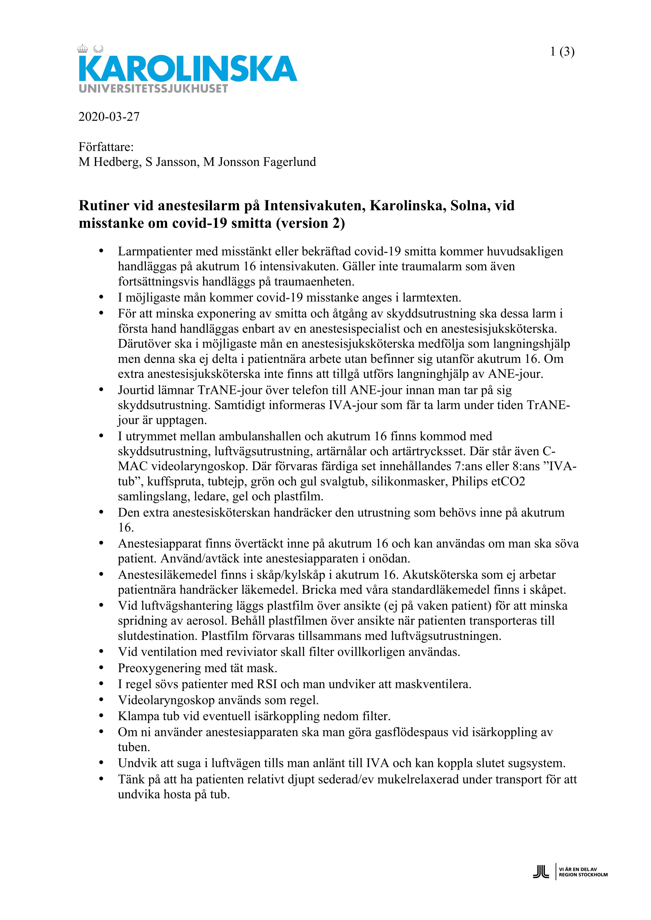 Dessa riktlinjer gäller vid Karolinska Universitetssjukhuset i Solna. Riktlinjerna får såklart användas på andra sjukhus – se dock till att förankra och eventuellt anpassa riktlinjerna för respektive verksamhet.