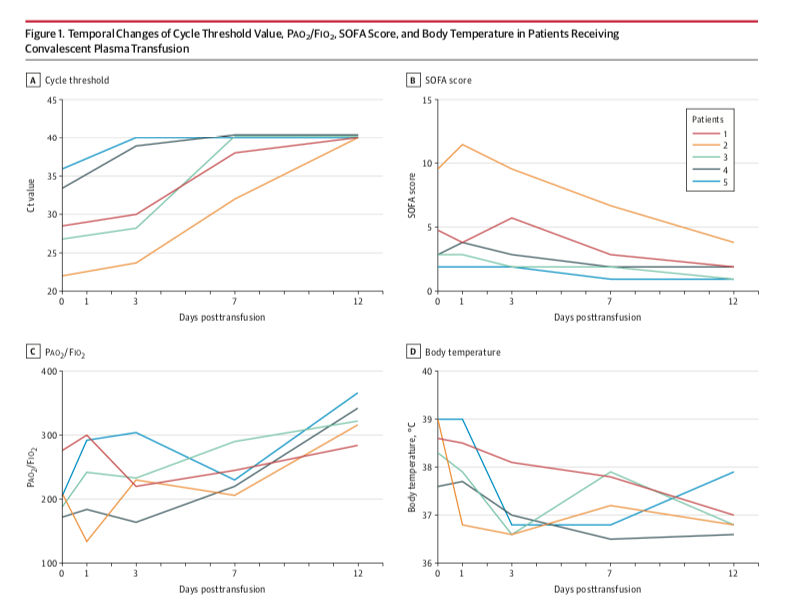 I en fallrapport av Shen et al. från Shenzhen, Kina redovisas utfallet från 5 patienter som erhöll plasma från patienter som genomgått COVID-19-infektion. Läs mer i JAMA: