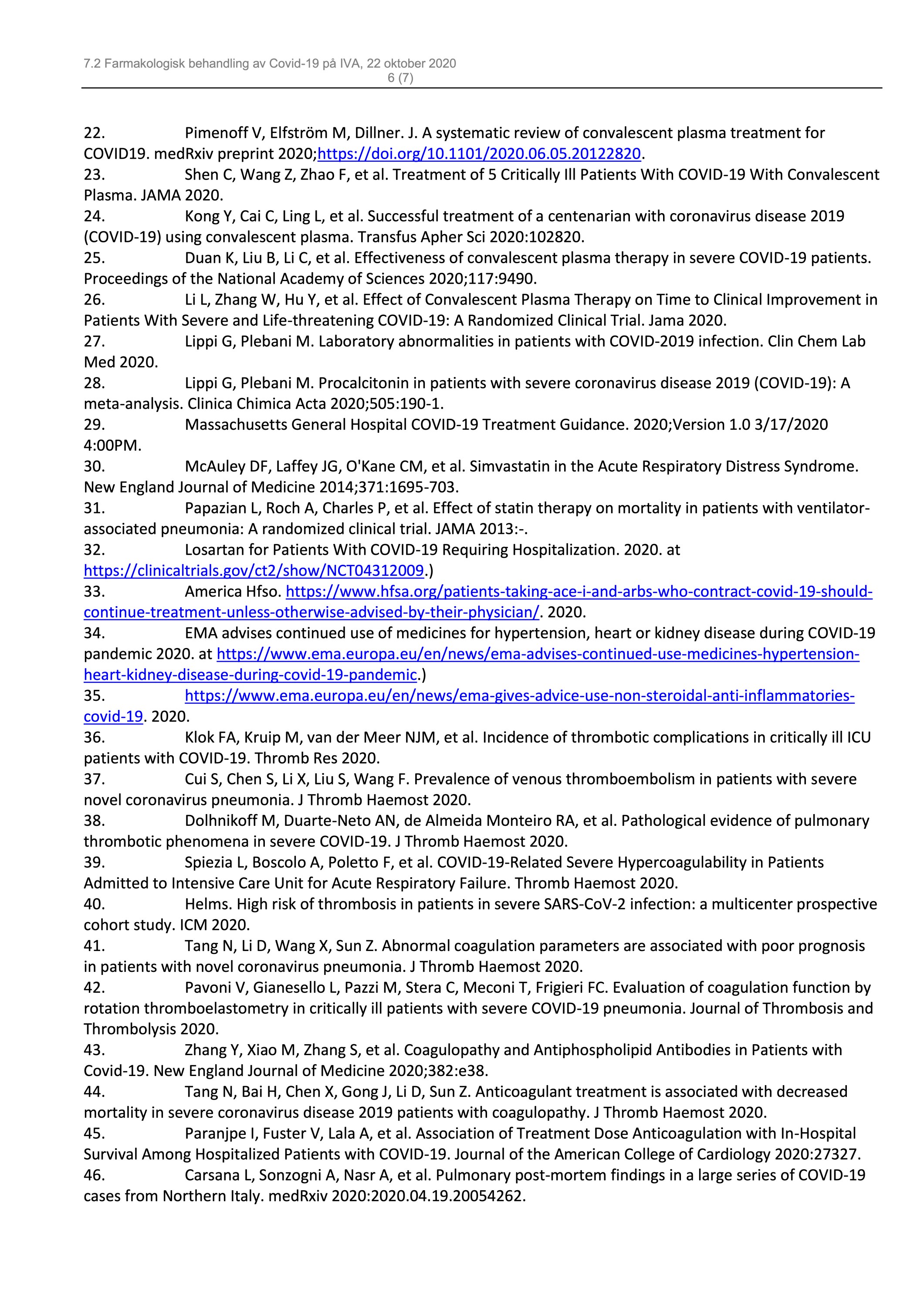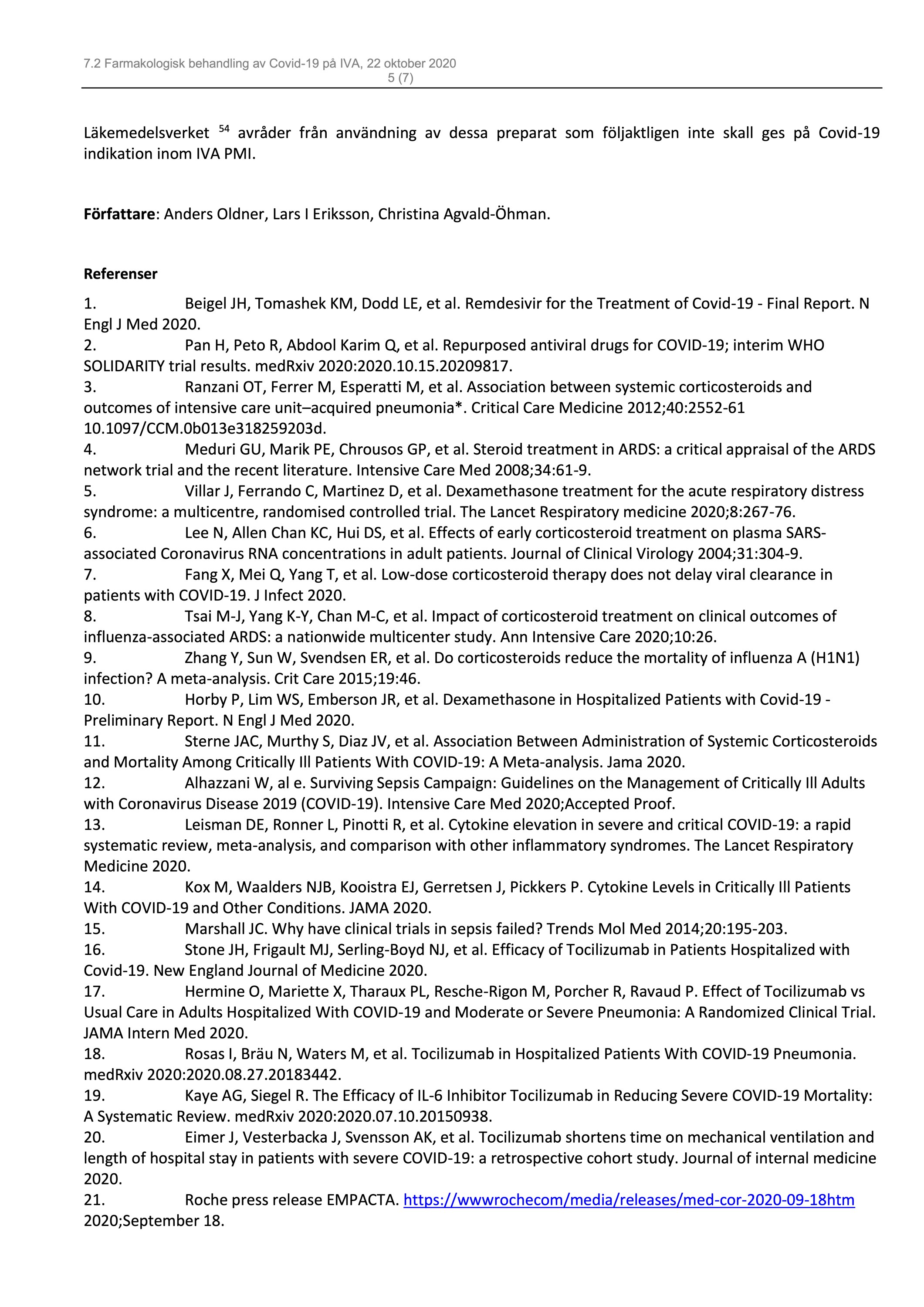 Nedanstående riktlinjer för farmakologisk behandling gäller som tillägg till de övriga riktlinjer som avser intensivvård av COVID-19 patienter. Denna revision är framtagen i samråd med företrädare för ME Infektion.