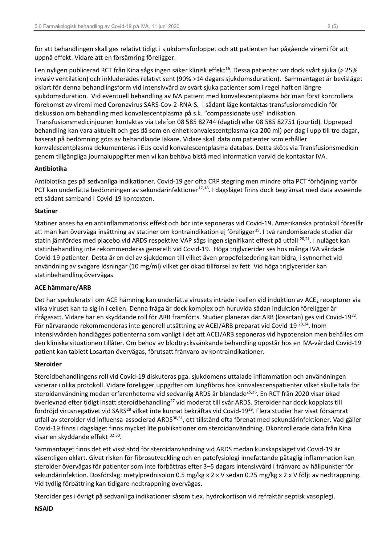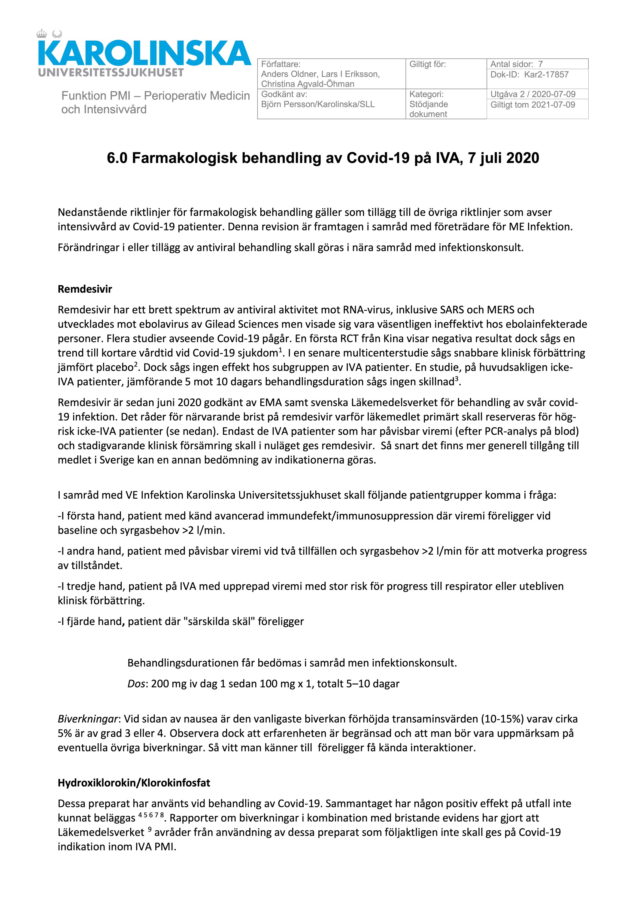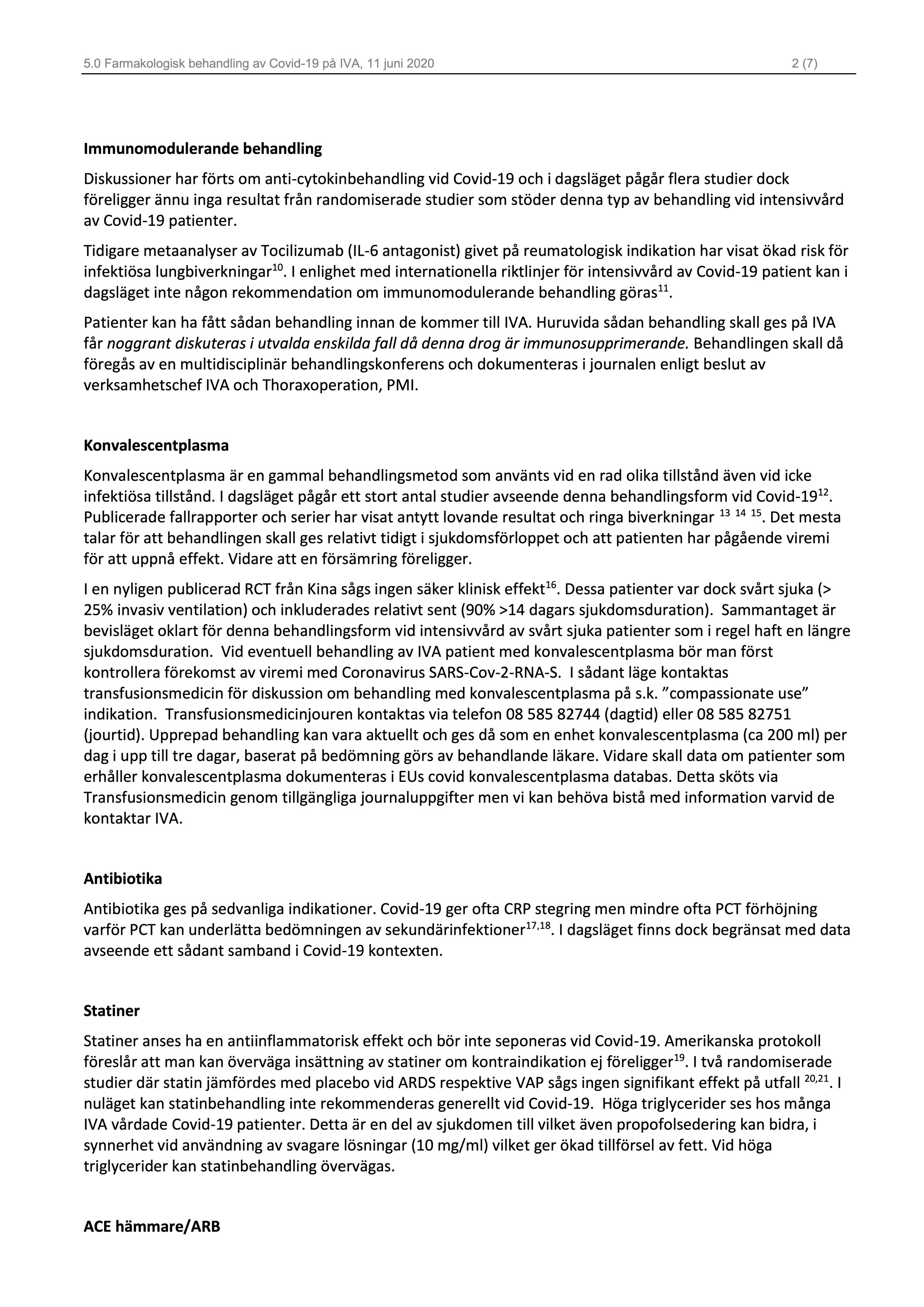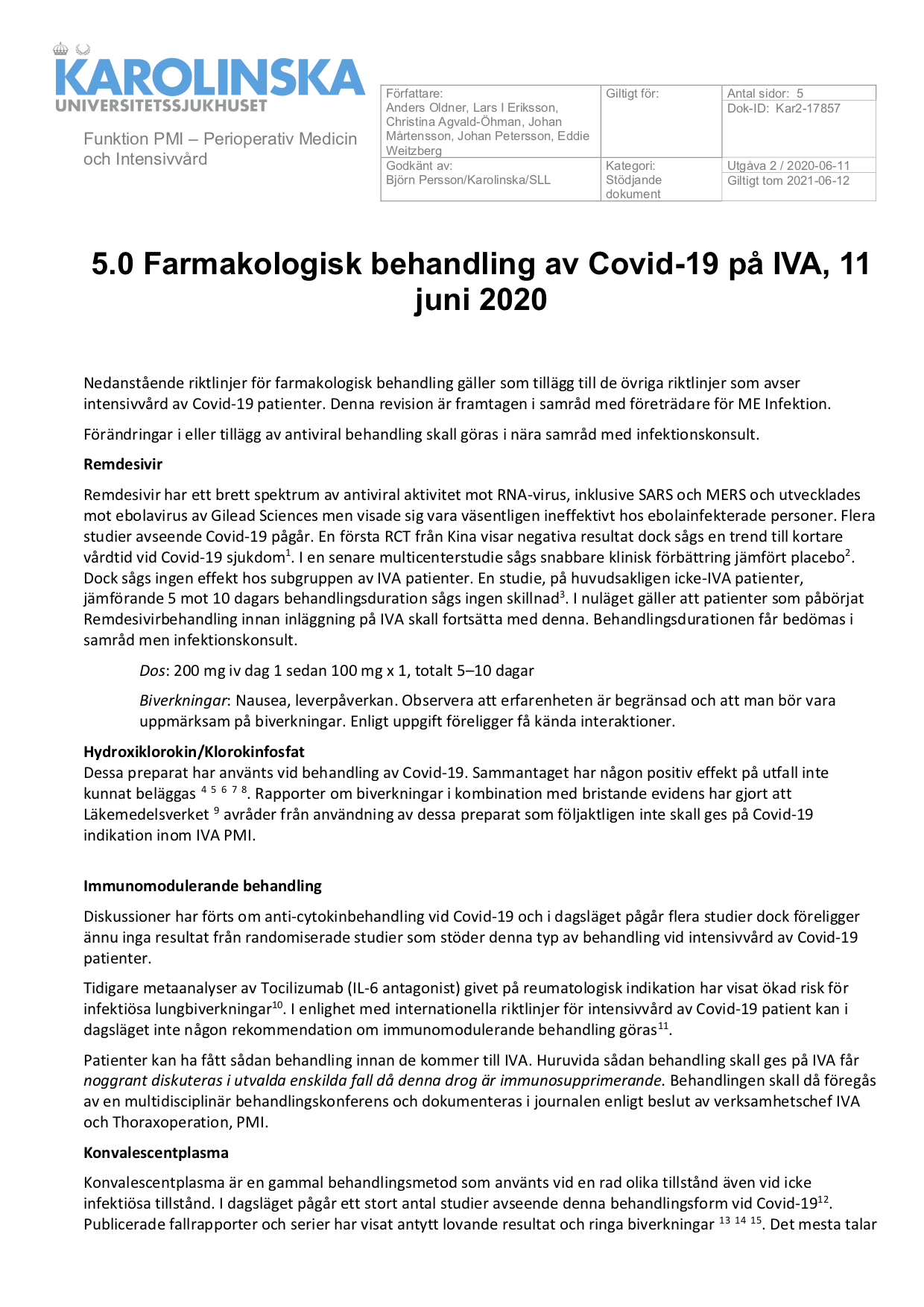 Nedanstående riktlinjer för farmakologisk behandling gäller som tillägg till de övriga riktlinjer som avser intensivvård av COVID-19 patienter. Denna revision är framtagen i samråd med företrädare för ME Infektion.
